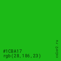 Цвет #1CBA17 в цветовой модели RGB обозначается тремя октетами (28, 186, 23) в десятичном формате и #1CBA17 в шестнадцатиричном (hex) формате, которые являются интенсивностью красного 28 (hex 1C), интенсивность зелёного 186 (hex BA) и интенсивность синего 23 (hex 17).