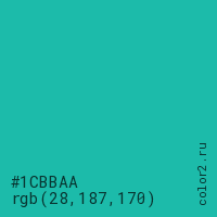 Цвет #1CBBAA в цветовой модели RGB обозначается тремя октетами (28, 187, 170) в десятичном формате и #1CBBAA в шестнадцатиричном (hex) формате, которые являются интенсивностью красного 28 (hex 1C), интенсивность зелёного 187 (hex BB) и интенсивность синего 170 (hex AA).