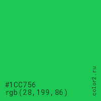 Цвет #1CC756 в цветовой модели RGB обозначается тремя октетами (28, 199, 86) в десятичном формате и #1CC756 в шестнадцатиричном (hex) формате, которые являются интенсивностью красного 28 (hex 1C), интенсивность зелёного 199 (hex C7) и интенсивность синего 86 (hex 56).