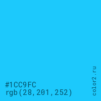 Цвет #1CC9FC в цветовой модели RGB обозначается тремя октетами (28, 201, 252) в десятичном формате и #1CC9FC в шестнадцатиричном (hex) формате, которые являются интенсивностью красного 28 (hex 1C), интенсивность зелёного 201 (hex C9) и интенсивность синего 252 (hex FC).