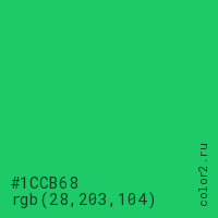 Цвет #1CCB68 в цветовой модели RGB обозначается тремя октетами (28, 203, 104) в десятичном формате и #1CCB68 в шестнадцатиричном (hex) формате, которые являются интенсивностью красного 28 (hex 1C), интенсивность зелёного 203 (hex CB) и интенсивность синего 104 (hex 68).
