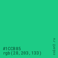 Цвет #1CCB85 в цветовой модели RGB обозначается тремя октетами (28, 203, 133) в десятичном формате и #1CCB85 в шестнадцатиричном (hex) формате, которые являются интенсивностью красного 28 (hex 1C), интенсивность зелёного 203 (hex CB) и интенсивность синего 133 (hex 85).