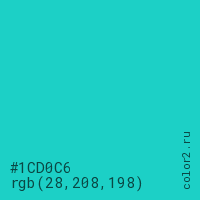 Цвет #1CD0C6 в цветовой модели RGB обозначается тремя октетами (28, 208, 198) в десятичном формате и #1CD0C6 в шестнадцатиричном (hex) формате, которые являются интенсивностью красного 28 (hex 1C), интенсивность зелёного 208 (hex D0) и интенсивность синего 198 (hex C6).