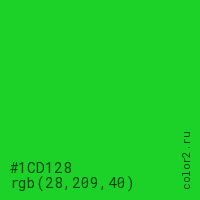 Цвет #1CD128 в цветовой модели RGB обозначается тремя октетами (28, 209, 40) в десятичном формате и #1CD128 в шестнадцатиричном (hex) формате, которые являются интенсивностью красного 28 (hex 1C), интенсивность зелёного 209 (hex D1) и интенсивность синего 40 (hex 28).