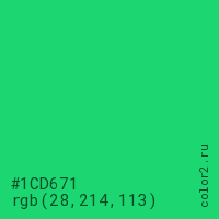 Цвет #1CD671 в цветовой модели RGB обозначается тремя октетами (28, 214, 113) в десятичном формате и #1CD671 в шестнадцатиричном (hex) формате, которые являются интенсивностью красного 28 (hex 1C), интенсивность зелёного 214 (hex D6) и интенсивность синего 113 (hex 71).