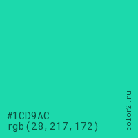 Цвет RGB(28, 217, 172) в процентом отношении количества цвета состоит из 11% красного (red), 85.1% зелёного (green) и 67.5% синего (blue).