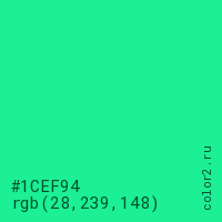 Цвет #1CEF94 в цветовой модели RGB обозначается тремя октетами (28, 239, 148) в десятичном формате и #1CEF94 в шестнадцатиричном (hex) формате, которые являются интенсивностью красного 28 (hex 1C), интенсивность зелёного 239 (hex EF) и интенсивность синего 148 (hex 94).