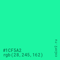 Цвет #1CF5A2 в цветовой модели RGB обозначается тремя октетами (28, 245, 162) в десятичном формате и #1CF5A2 в шестнадцатиричном (hex) формате, которые являются интенсивностью красного 28 (hex 1C), интенсивность зелёного 245 (hex F5) и интенсивность синего 162 (hex A2).