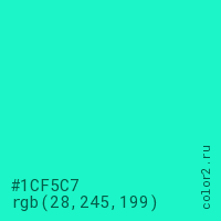 Цвет #1CF5C7 в цветовой модели RGB обозначается тремя октетами (28, 245, 199) в десятичном формате и #1CF5C7 в шестнадцатиричном (hex) формате, которые являются интенсивностью красного 28 (hex 1C), интенсивность зелёного 245 (hex F5) и интенсивность синего 199 (hex C7).