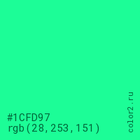 Цвет #1CFD97 в цветовой модели RGB обозначается тремя октетами (28, 253, 151) в десятичном формате и #1CFD97 в шестнадцатиричном (hex) формате, которые являются интенсивностью красного 28 (hex 1C), интенсивность зелёного 253 (hex FD) и интенсивность синего 151 (hex 97).