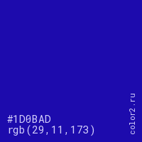 Цвет #1D0BAD в цветовой модели RGB обозначается тремя октетами (29, 11, 173) в десятичном формате и #1D0BAD в шестнадцатиричном (hex) формате, которые являются интенсивностью красного 29 (hex 1D), интенсивность зелёного 11 (hex 0B) и интенсивность синего 173 (hex AD).