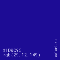 Цвет #1D0C95 в цветовой модели RGB обозначается тремя октетами (29, 12, 149) в десятичном формате и #1D0C95 в шестнадцатиричном (hex) формате, которые являются интенсивностью красного 29 (hex 1D), интенсивность зелёного 12 (hex 0C) и интенсивность синего 149 (hex 95).