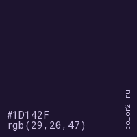 Цвет #1D142F в цветовой модели RGB обозначается тремя октетами (29, 20, 47) в десятичном формате и #1D142F в шестнадцатиричном (hex) формате, которые являются интенсивностью красного 29 (hex 1D), интенсивность зелёного 20 (hex 14) и интенсивность синего 47 (hex 2F).