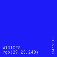 Цвет #1D1CF8 в цветовой модели RGB обозначается тремя октетами (29, 28, 248) в десятичном формате и #1D1CF8 в шестнадцатиричном (hex) формате, которые являются интенсивностью красного 29 (hex 1D), интенсивность зелёного 28 (hex 1C) и интенсивность синего 248 (hex F8).