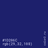 Цвет #1D206C в цветовой модели RGB обозначается тремя октетами (29, 32, 108) в десятичном формате и #1D206C в шестнадцатиричном (hex) формате, которые являются интенсивностью красного 29 (hex 1D), интенсивность зелёного 32 (hex 20) и интенсивность синего 108 (hex 6C).