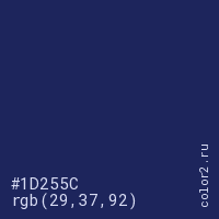 Цвет #1D255C в цветовой модели RGB обозначается тремя октетами (29, 37, 92) в десятичном формате и #1D255C в шестнадцатиричном (hex) формате, которые являются интенсивностью красного 29 (hex 1D), интенсивность зелёного 37 (hex 25) и интенсивность синего 92 (hex 5C).