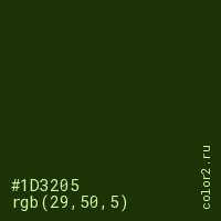 Цвет #1D3205 в цветовой модели RGB обозначается тремя октетами (29, 50, 5) в десятичном формате и #1D3205 в шестнадцатиричном (hex) формате, которые являются интенсивностью красного 29 (hex 1D), интенсивность зелёного 50 (hex 32) и интенсивность синего 5 (hex 05).