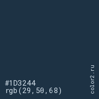 Цвет #1D3244 в цветовой модели RGB обозначается тремя октетами (29, 50, 68) в десятичном формате и #1D3244 в шестнадцатиричном (hex) формате, которые являются интенсивностью красного 29 (hex 1D), интенсивность зелёного 50 (hex 32) и интенсивность синего 68 (hex 44).