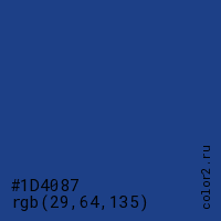 Цвет #1D4087 в цветовой модели RGB обозначается тремя октетами (29, 64, 135) в десятичном формате и #1D4087 в шестнадцатиричном (hex) формате, которые являются интенсивностью красного 29 (hex 1D), интенсивность зелёного 64 (hex 40) и интенсивность синего 135 (hex 87).