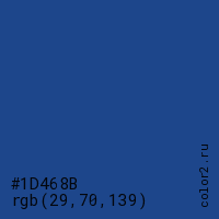 Цвет #1D468B в цветовой модели RGB обозначается тремя октетами (29, 70, 139) в десятичном формате и #1D468B в шестнадцатиричном (hex) формате, которые являются интенсивностью красного 29 (hex 1D), интенсивность зелёного 70 (hex 46) и интенсивность синего 139 (hex 8B).