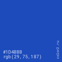 Цвет #1D4BBB в цветовой модели RGB обозначается тремя октетами (29, 75, 187) в десятичном формате и #1D4BBB в шестнадцатиричном (hex) формате, которые являются интенсивностью красного 29 (hex 1D), интенсивность зелёного 75 (hex 4B) и интенсивность синего 187 (hex BB).