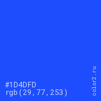 Цвет #1D4DFD в цветовой модели RGB обозначается тремя октетами (29, 77, 253) в десятичном формате и #1D4DFD в шестнадцатиричном (hex) формате, которые являются интенсивностью красного 29 (hex 1D), интенсивность зелёного 77 (hex 4D) и интенсивность синего 253 (hex FD).