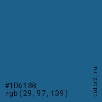 Цвет #1D618B в цветовой модели RGB обозначается тремя октетами (29, 97, 139) в десятичном формате и #1D618B в шестнадцатиричном (hex) формате, которые являются интенсивностью красного 29 (hex 1D), интенсивность зелёного 97 (hex 61) и интенсивность синего 139 (hex 8B).