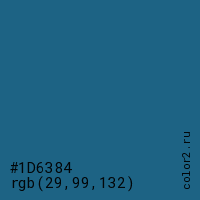Цвет #1D6384 в цветовой модели RGB обозначается тремя октетами (29, 99, 132) в десятичном формате и #1D6384 в шестнадцатиричном (hex) формате, которые являются интенсивностью красного 29 (hex 1D), интенсивность зелёного 99 (hex 63) и интенсивность синего 132 (hex 84).