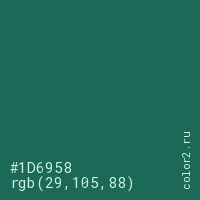 Цвет #1D6958 в цветовой модели RGB обозначается тремя октетами (29, 105, 88) в десятичном формате и #1D6958 в шестнадцатиричном (hex) формате, которые являются интенсивностью красного 29 (hex 1D), интенсивность зелёного 105 (hex 69) и интенсивность синего 88 (hex 58).