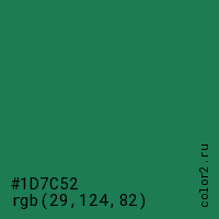 Цвет #1D7C52 в цветовой модели RGB обозначается тремя октетами (29, 124, 82) в десятичном формате и #1D7C52 в шестнадцатиричном (hex) формате, которые являются интенсивностью красного 29 (hex 1D), интенсивность зелёного 124 (hex 7C) и интенсивность синего 82 (hex 52).