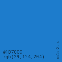 Цвет #1D7CCC в цветовой модели RGB обозначается тремя октетами (29, 124, 204) в десятичном формате и #1D7CCC в шестнадцатиричном (hex) формате, которые являются интенсивностью красного 29 (hex 1D), интенсивность зелёного 124 (hex 7C) и интенсивность синего 204 (hex CC).