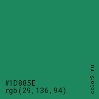 Цвет #1D885E в цветовой модели RGB обозначается тремя октетами (29, 136, 94) в десятичном формате и #1D885E в шестнадцатиричном (hex) формате, которые являются интенсивностью красного 29 (hex 1D), интенсивность зелёного 136 (hex 88) и интенсивность синего 94 (hex 5E).
