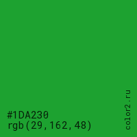 Цвет #1DA230 в цветовой модели RGB обозначается тремя октетами (29, 162, 48) в десятичном формате и #1DA230 в шестнадцатиричном (hex) формате, которые являются интенсивностью красного 29 (hex 1D), интенсивность зелёного 162 (hex A2) и интенсивность синего 48 (hex 30).