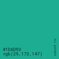 Цвет #1DAD93 в цветовой модели RGB обозначается тремя октетами (29, 173, 147) в десятичном формате и #1DAD93 в шестнадцатиричном (hex) формате, которые являются интенсивностью красного 29 (hex 1D), интенсивность зелёного 173 (hex AD) и интенсивность синего 147 (hex 93).