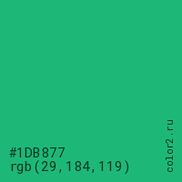 Цвет #1DB877 в цветовой модели RGB обозначается тремя октетами (29, 184, 119) в десятичном формате и #1DB877 в шестнадцатиричном (hex) формате, которые являются интенсивностью красного 29 (hex 1D), интенсивность зелёного 184 (hex B8) и интенсивность синего 119 (hex 77).