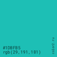 Цвет #1DBFB5 в цветовой модели RGB обозначается тремя октетами (29, 191, 181) в десятичном формате и #1DBFB5 в шестнадцатиричном (hex) формате, которые являются интенсивностью красного 29 (hex 1D), интенсивность зелёного 191 (hex BF) и интенсивность синего 181 (hex B5).