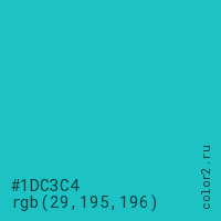 Цвет #1DC3C4 в цветовой модели RGB обозначается тремя октетами (29, 195, 196) в десятичном формате и #1DC3C4 в шестнадцатиричном (hex) формате, которые являются интенсивностью красного 29 (hex 1D), интенсивность зелёного 195 (hex C3) и интенсивность синего 196 (hex C4).