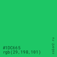 Цвет #1DC665 в цветовой модели RGB обозначается тремя октетами (29, 198, 101) в десятичном формате и #1DC665 в шестнадцатиричном (hex) формате, которые являются интенсивностью красного 29 (hex 1D), интенсивность зелёного 198 (hex C6) и интенсивность синего 101 (hex 65).