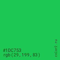 Цвет #1DC753 в цветовой модели RGB обозначается тремя октетами (29, 199, 83) в десятичном формате и #1DC753 в шестнадцатиричном (hex) формате, которые являются интенсивностью красного 29 (hex 1D), интенсивность зелёного 199 (hex C7) и интенсивность синего 83 (hex 53).