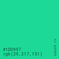 Цвет #1DD997 в цветовой модели RGB обозначается тремя октетами (29, 217, 151) в десятичном формате и #1DD997 в шестнадцатиричном (hex) формате, которые являются интенсивностью красного 29 (hex 1D), интенсивность зелёного 217 (hex D9) и интенсивность синего 151 (hex 97).
