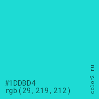 Цвет #1DDBD4 в цветовой модели RGB обозначается тремя октетами (29, 219, 212) в десятичном формате и #1DDBD4 в шестнадцатиричном (hex) формате, которые являются интенсивностью красного 29 (hex 1D), интенсивность зелёного 219 (hex DB) и интенсивность синего 212 (hex D4).