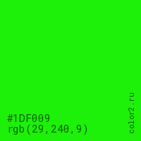Цвет #1DF009 в цветовой модели RGB обозначается тремя октетами (29, 240, 9) в десятичном формате и #1DF009 в шестнадцатиричном (hex) формате, которые являются интенсивностью красного 29 (hex 1D), интенсивность зелёного 240 (hex F0) и интенсивность синего 9 (hex 09).