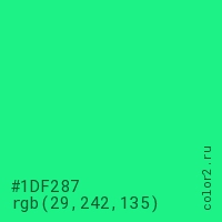 Цвет #1DF287 в цветовой модели RGB обозначается тремя октетами (29, 242, 135) в десятичном формате и #1DF287 в шестнадцатиричном (hex) формате, которые являются интенсивностью красного 29 (hex 1D), интенсивность зелёного 242 (hex F2) и интенсивность синего 135 (hex 87).