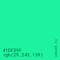 Цвет #1DF39F в цветовой модели RGB обозначается тремя октетами (29, 243, 159) в десятичном формате и #1DF39F в шестнадцатиричном (hex) формате, которые являются интенсивностью красного 29 (hex 1D), интенсивность зелёного 243 (hex F3) и интенсивность синего 159 (hex 9F).