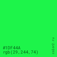 Цвет #1DF44A в цветовой модели RGB обозначается тремя октетами (29, 244, 74) в десятичном формате и #1DF44A в шестнадцатиричном (hex) формате, которые являются интенсивностью красного 29 (hex 1D), интенсивность зелёного 244 (hex F4) и интенсивность синего 74 (hex 4A).