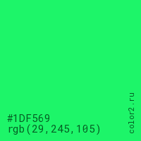 Цвет #1DF569 в цветовой модели RGB обозначается тремя октетами (29, 245, 105) в десятичном формате и #1DF569 в шестнадцатиричном (hex) формате, которые являются интенсивностью красного 29 (hex 1D), интенсивность зелёного 245 (hex F5) и интенсивность синего 105 (hex 69).