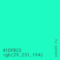 Цвет #1DFBC2 в цветовой модели RGB обозначается тремя октетами (29, 251, 194) в десятичном формате и #1DFBC2 в шестнадцатиричном (hex) формате, которые являются интенсивностью красного 29 (hex 1D), интенсивность зелёного 251 (hex FB) и интенсивность синего 194 (hex C2).