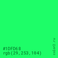 Цвет #1DFD68 в цветовой модели RGB обозначается тремя октетами (29, 253, 104) в десятичном формате и #1DFD68 в шестнадцатиричном (hex) формате, которые являются интенсивностью красного 29 (hex 1D), интенсивность зелёного 253 (hex FD) и интенсивность синего 104 (hex 68).