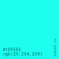Цвет #1DFEEE в цветовой модели RGB обозначается тремя октетами (29, 254, 238) в десятичном формате и #1DFEEE в шестнадцатиричном (hex) формате, которые являются интенсивностью красного 29 (hex 1D), интенсивность зелёного 254 (hex FE) и интенсивность синего 238 (hex EE).