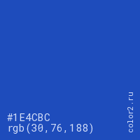 Цвет #1E4CBC в цветовой модели RGB обозначается тремя октетами (30, 76, 188) в десятичном формате и #1E4CBC в шестнадцатиричном (hex) формате, которые являются интенсивностью красного 30 (hex 1E), интенсивность зелёного 76 (hex 4C) и интенсивность синего 188 (hex BC).